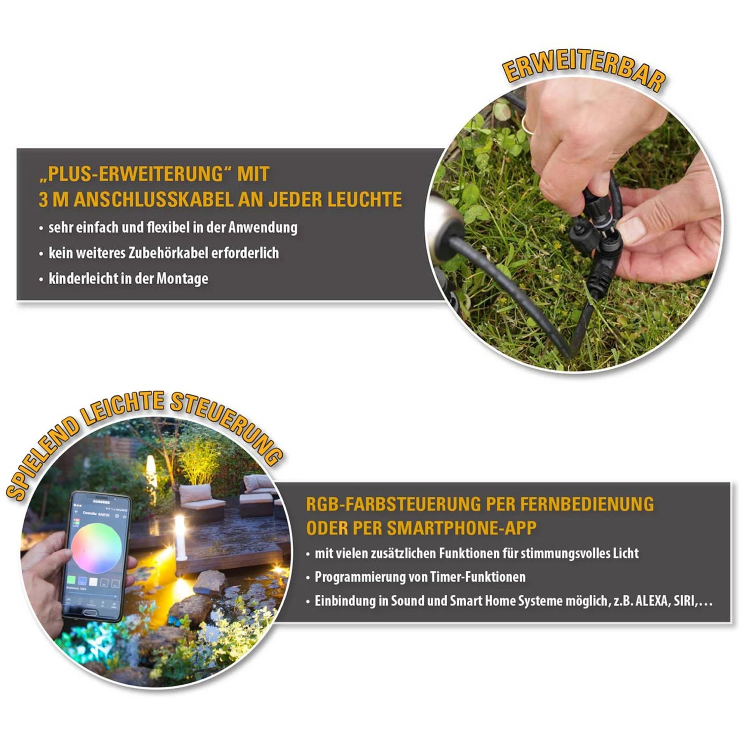 Die 1 Watt Spots lassen sich dank der „Plus-“ Erweiterung schnell und einfach in Reihe erweitern. Das Set wird inklusive Transformator und Dämmerungssensor geliefert. Das SMART LIGHTS läßt sich über einen WiFI-Controller auch in ihr Smart Home integrieren und kann über Sprachsteuerung (z.B. Amazon Alexa und Google HOME) angesteuert werden. Über die SMARTLIGHTS-APP kann der WiFi-Controller von Heissner direkt angesprochen werden. Diese steht kostenlos im Google Play Store und im Apple AppStore zur Verfügung.