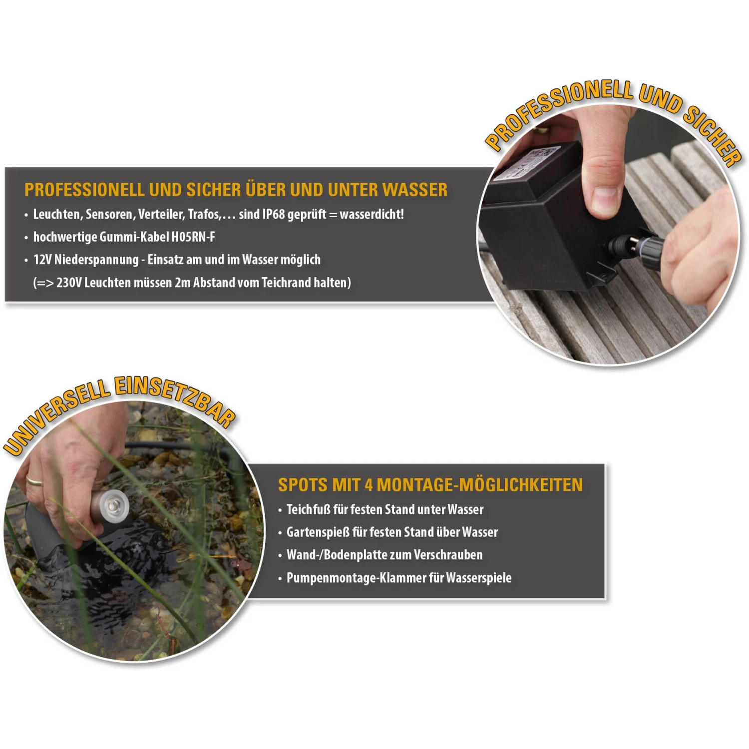- 12V Niederspannung – Einsatz am und im Wasser möglich