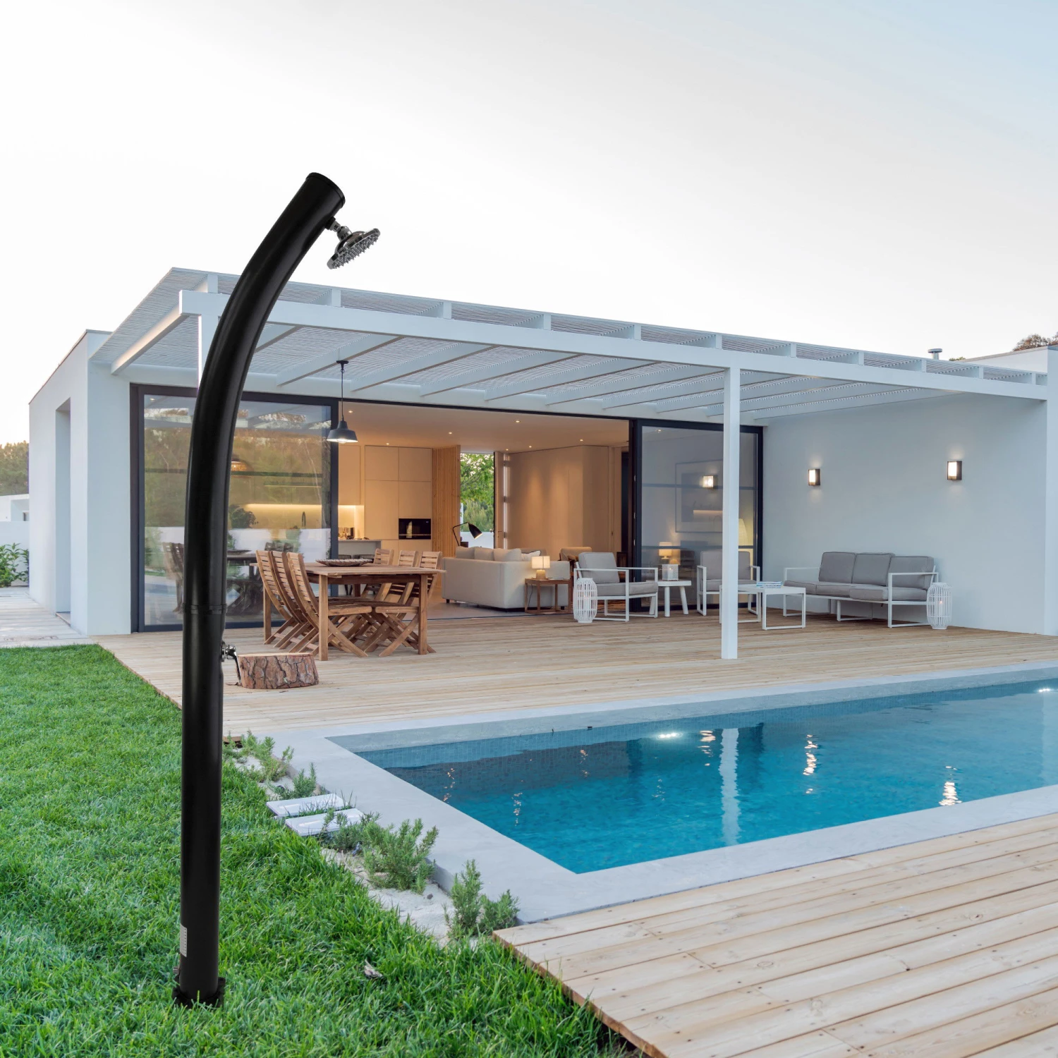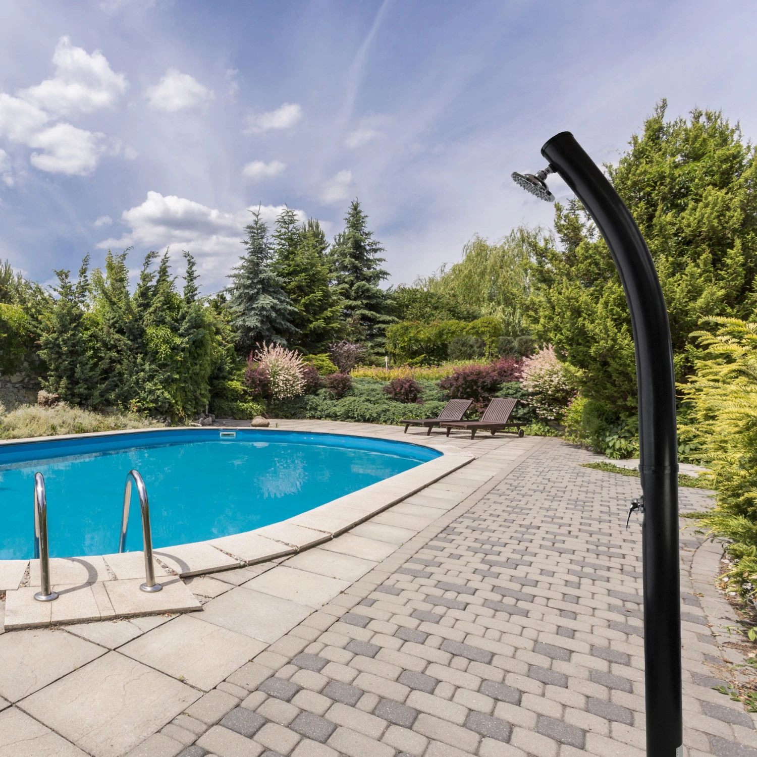 Installiere einfach eine unserer schicken Solar-Gartenduschen in der Nähe deines Schwimmbeckens. So kannst du warmes Wasser ganz ohne Stromverbrauch genießen. Denn das Wasser wird hier einfach durch die Kraft der Sonne erwärmt.