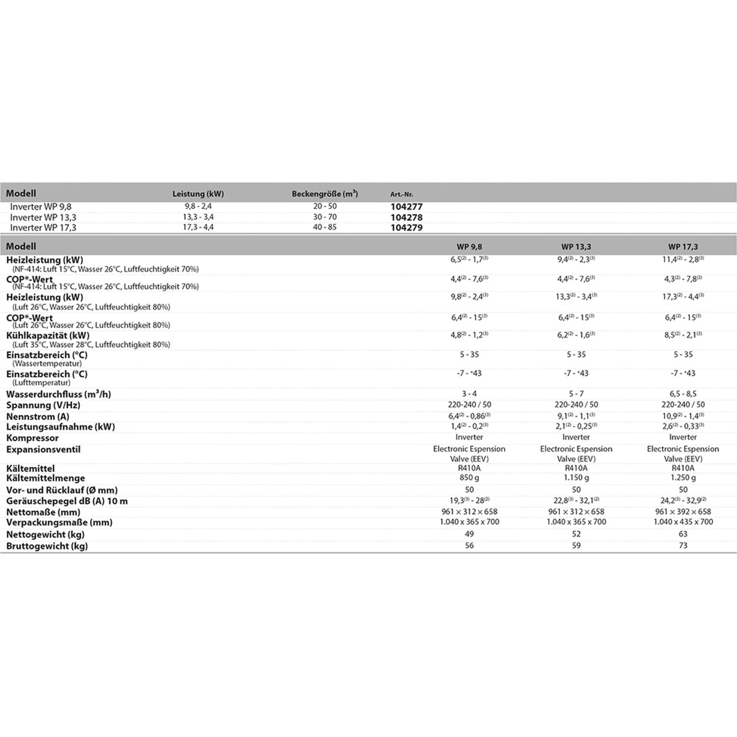 - COP-Wert (NF-414: bei 15°C Luft, 26°C Wassertemperatur und 70% Luftfeuchtigkeit): 4,4² – 7,6³