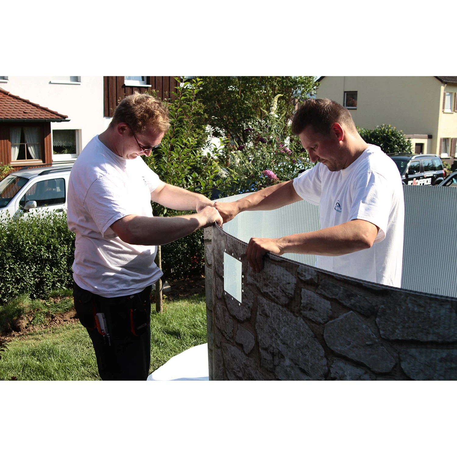 Dieser Rundformpool hat eine wählbare Größe, ist 120 cm tief und die Außenfarbe Steinoptik.
