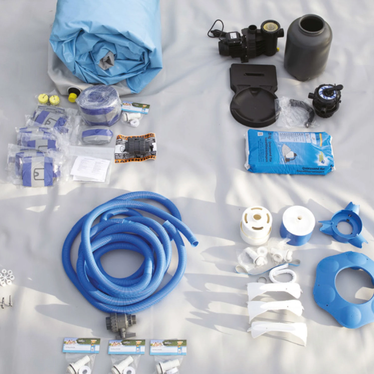 Zum Zodiac Original-Kit gehört ein Schwimmbecken, eine Sicherheitsleiter aus Edelstahl, ein Sandfilter, eine Filterpumpe, ein oder zwei Schwimmskimmer (je nach Größe des Pools), eine elektrische Aufblasvorrichtung, ein Satz Schlauchverbindungen mit Ø 38 mm und eine Montageanleitung.